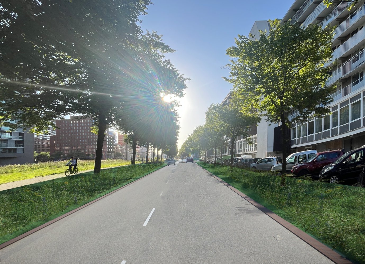 De ventweg aan de zuidkant en de groenstrook aan de noordkant krijgen een nieuwe inrichting. Er komt meer ruimte voor bomen en er wordt gekeken naar extra waterpartijen. Zo wordt de straat groener en toekomstbestendig.